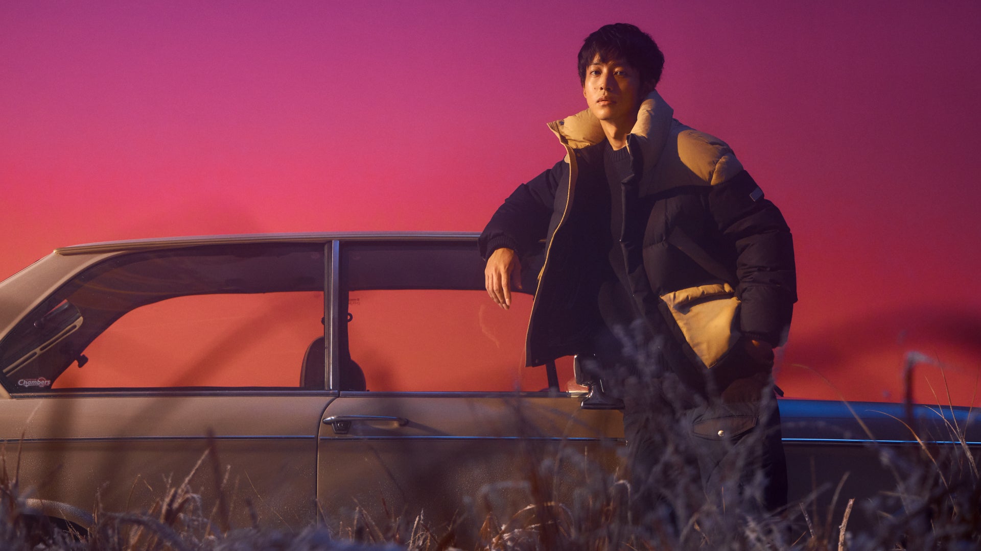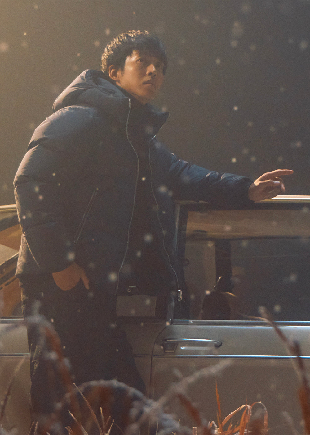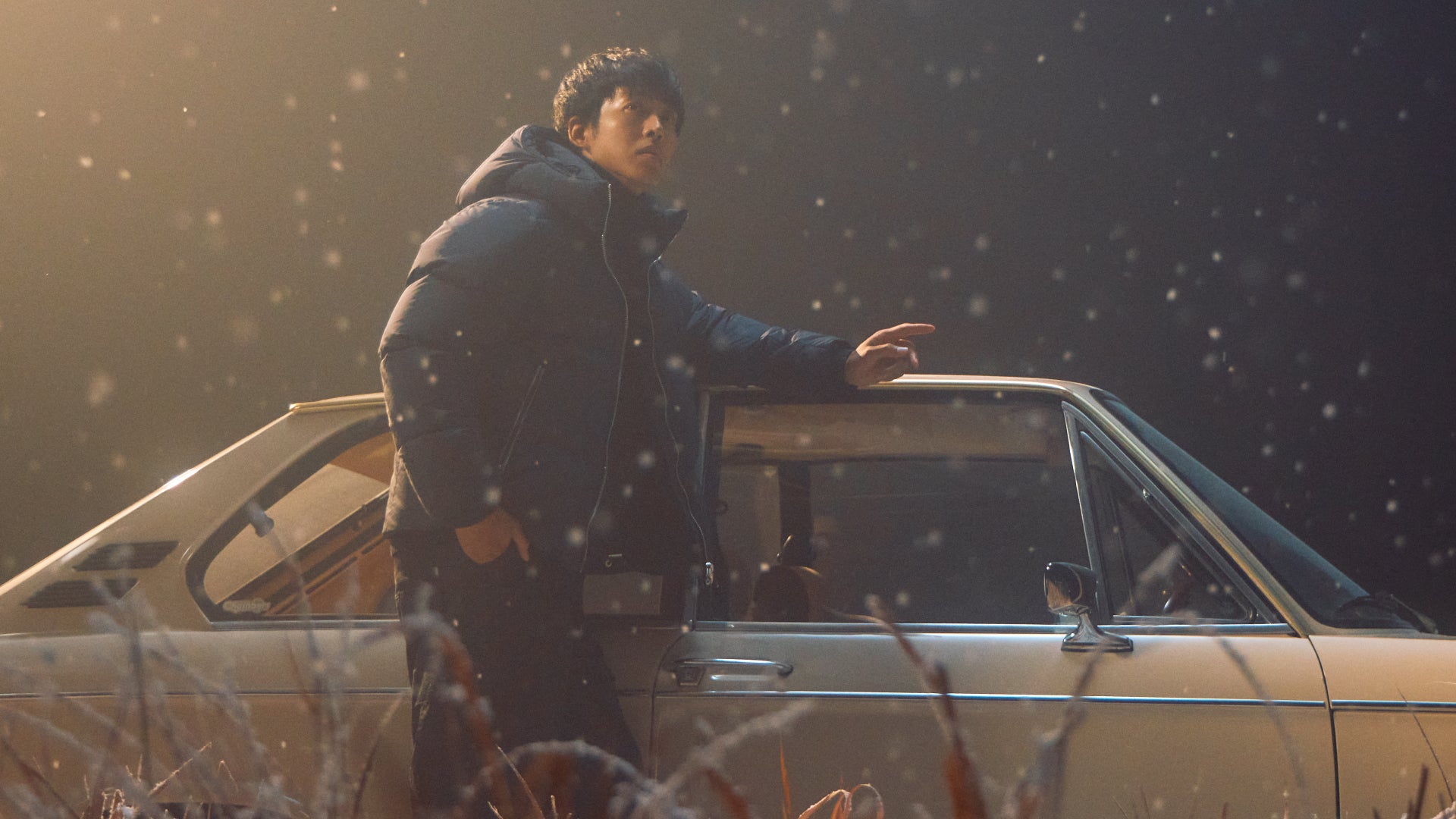 「待つ」という静かな行為を主題に、冬の夜の雪景色で松坂桃李が古びた車と無線機のそばで“何か”を待つ、映画の一場面のような詩的な世界を描きます。