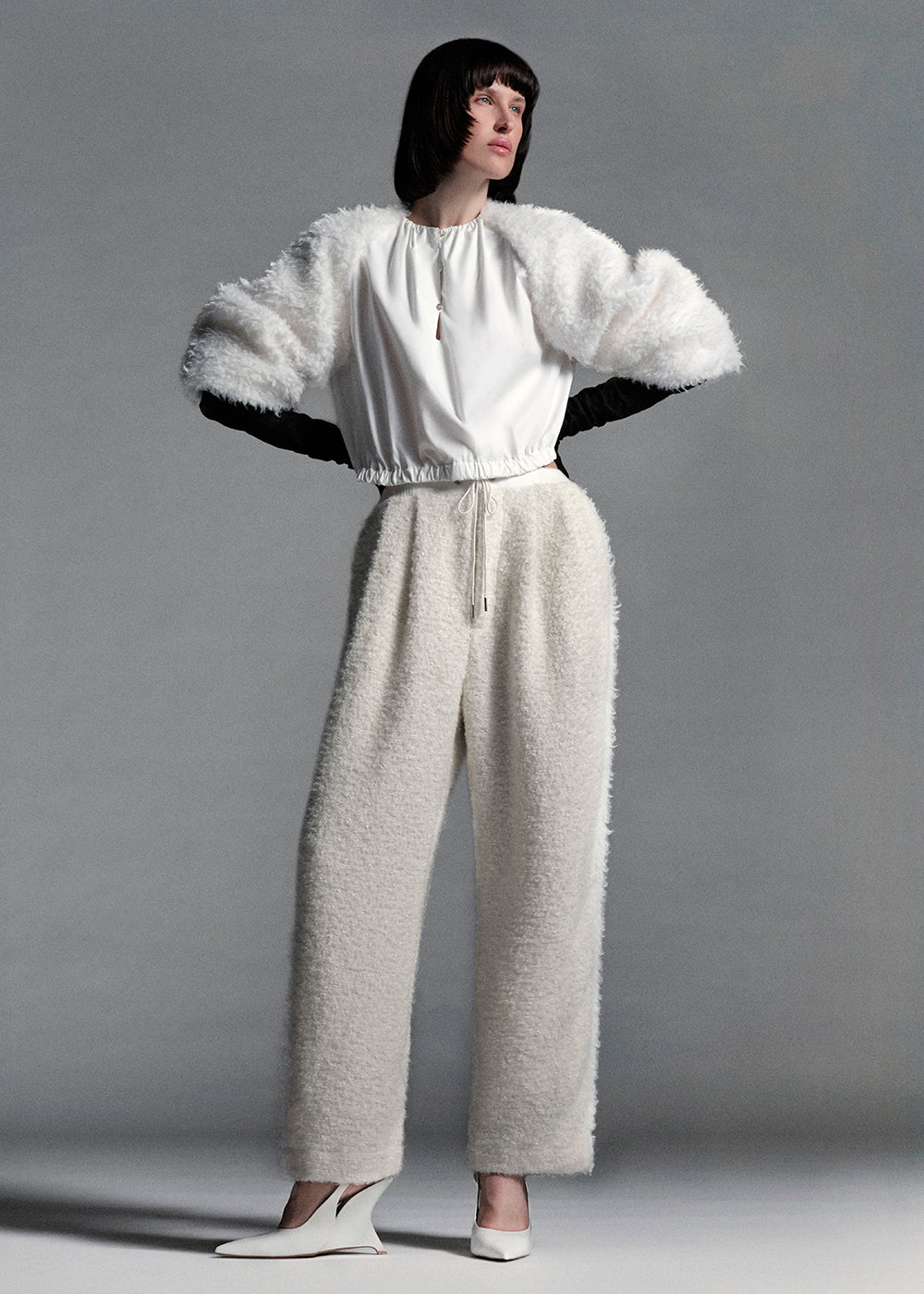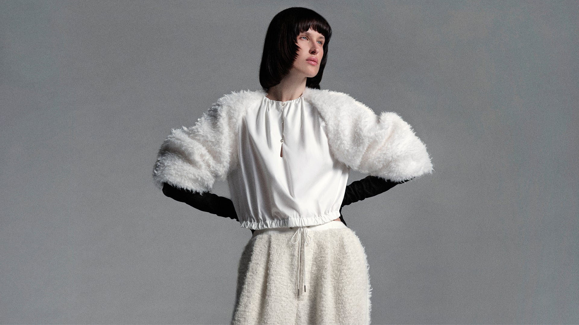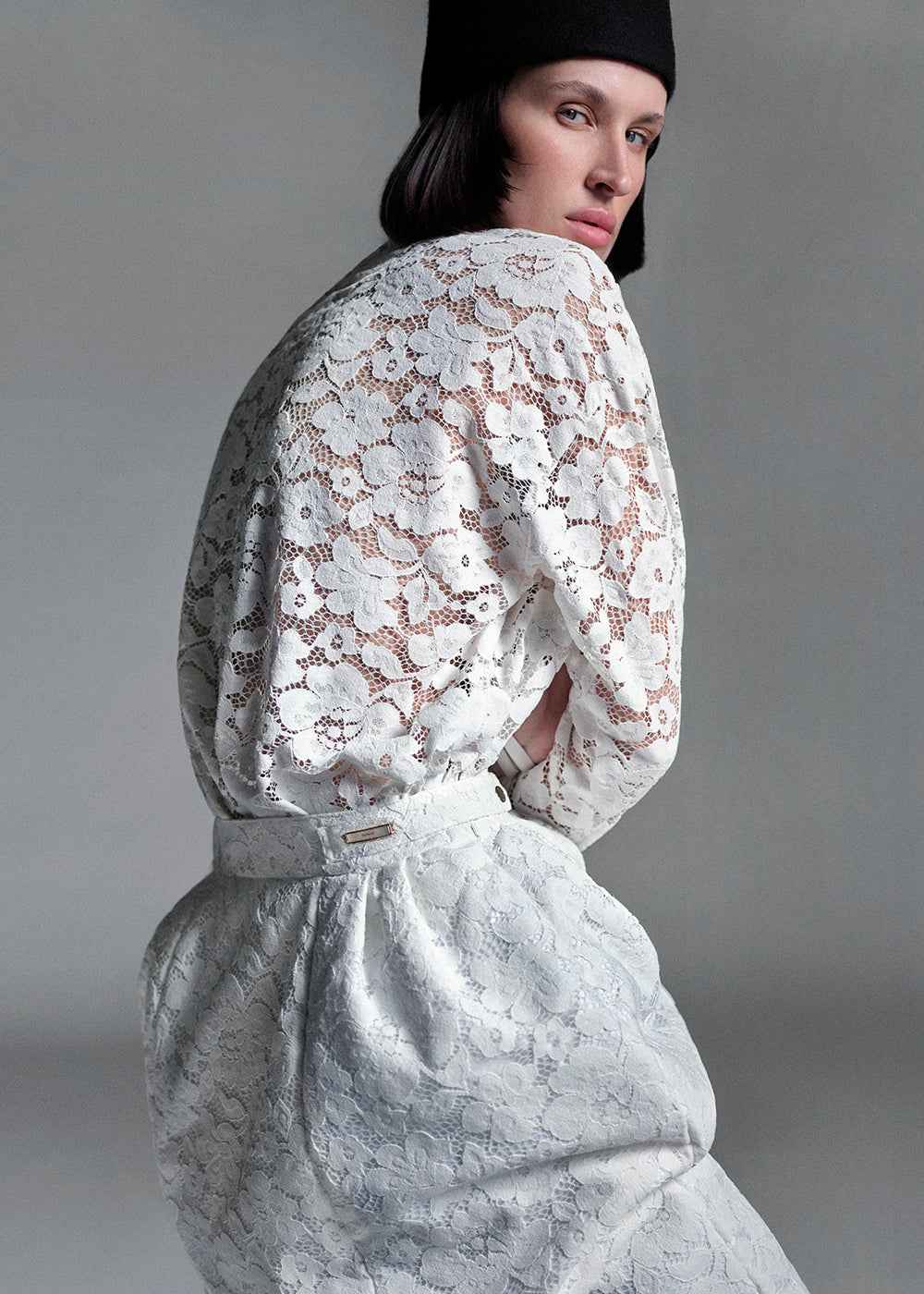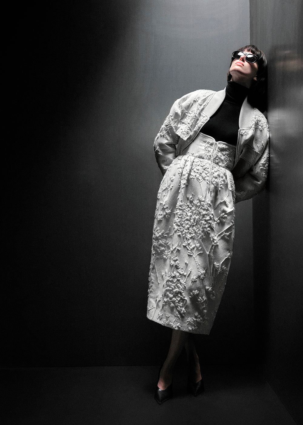 起毛感のある表情豊かなレース、複数の糸に繊細なスパンコール糸を織り込んだウールツイード、そしてシルバーとホワイトのジャカードといったマテリアルを厳選し、光を受けて奥ゆかしくきらめく質感に仕上げました。