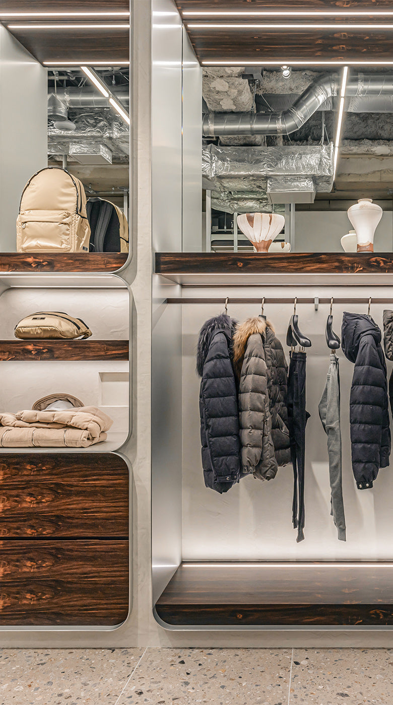 ファーには Saga Furs を採用し、リサイクルナイロンの活用や修理工房の設置など、持続可能なものづくりを積極的に進めています。